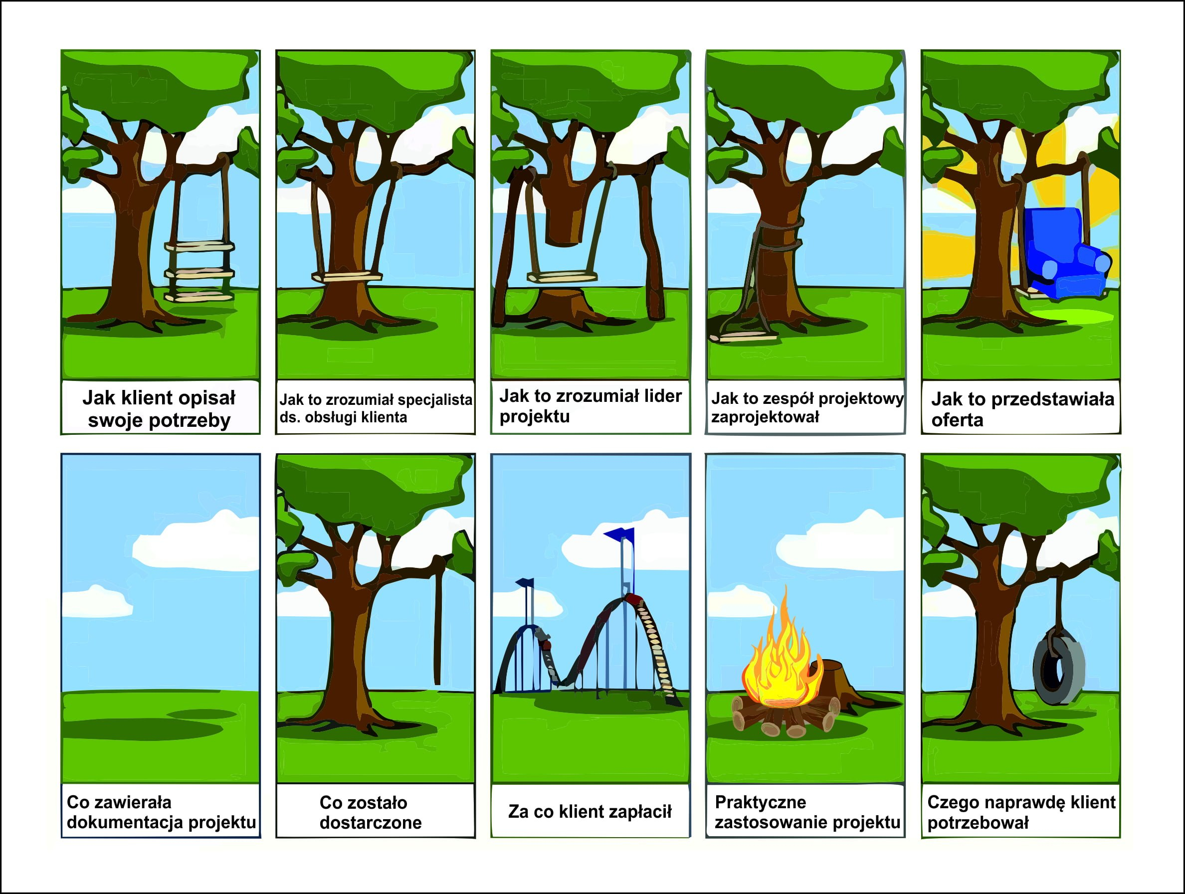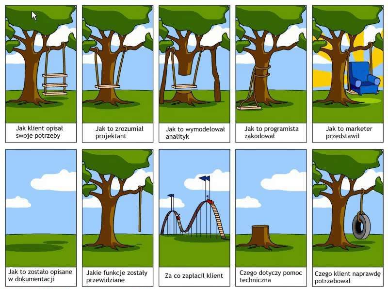 Chyba każdy w IT zna ten rysunek. Osobiście uwielbiam go 🙂 Mało co pokazuje jak złożone jest tworzenie projektów i rozumienie perspektywy innych.